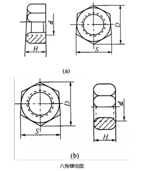 螺母,統(tǒng)稱為六角螺母。分半精制和精制兩種。按螺母結(jié)構(gòu)形式還可分為A型和B型兩種,如圖12-2-10所示。