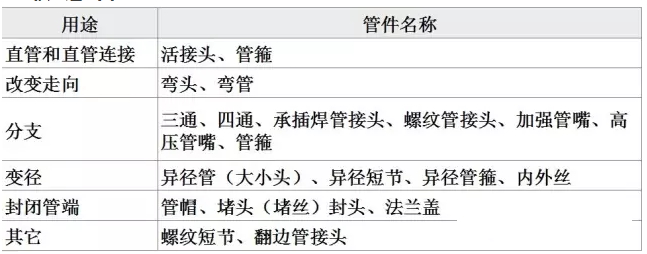 在管系中改變走向、標(biāo)高或改變管徑以及由主管上引出支管等均需用管件。由于管系形狀各異、簡繁不等,因此,管件的種類較多。常用的管件有彎頭、三通、異徑管、管接頭、管帽等。